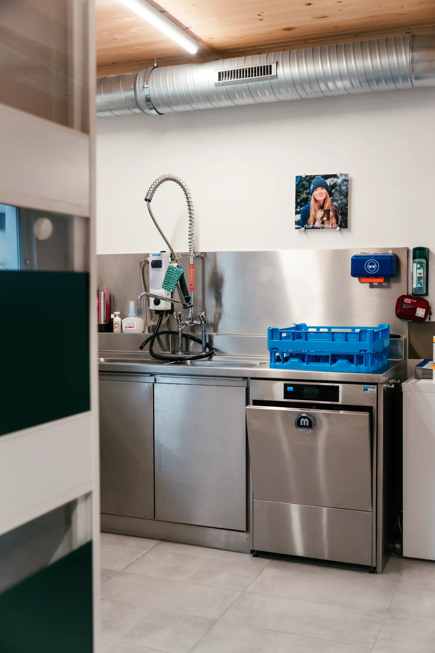 La préparation de la nourriture se fait dans une cuisine spécialement aménagée pour les hérissons. Celle-ci est comparable à une cuisine gastronomique professionnelle en acier chromé et dispose d’un lave-vaisselle industriel.